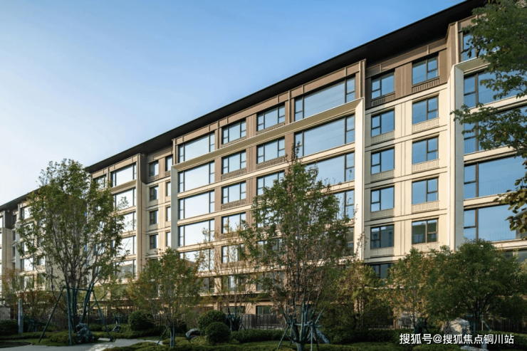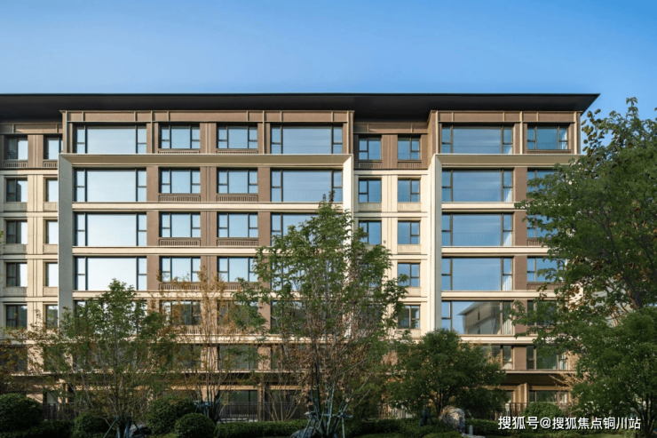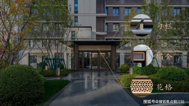 举目而望,B地块洋房建筑线条严谨方正,基座的“描金”元素,灵感取自宋代漆器,线性描金体系打破深色墙面的沉闷感,与铝合金框一起形成宋画的“线描”手法,细节处的雕琢,成就建筑简洁舒展的贵雅质感;“花格”构造,写意隔而不断的空间营造;凸出的挑檐简约大气,门厅屋顶上的“勾栏”元素,令建筑更具细腻层次,视觉上轻盈精致,优美舒展。