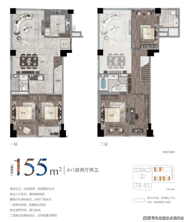 锦绣公馆即将推出的产品,是建面约155㎡的“空中跃墅”,之所以如此命名,正是因为它开创性地包容了大平层和叠墅,二者的妙处,得而兼之。