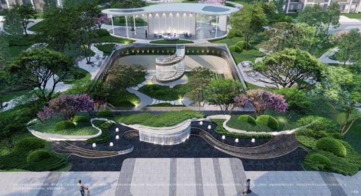 项目内部规划了约8.2万方超大园林景观,有南北景观中轴、东西景观中轴和多个季节性植物景观组团,规划有拾级而上的台阶和叠瀑水景、有约600㎡下沉式庭院,营造出了空中花园的意境。