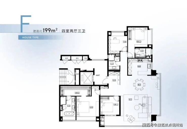 建面约199㎡四房两厅三卫,高端改善户型,270°采光大客厅,据了解该户型靠近江边,拥有很好的观江视野。