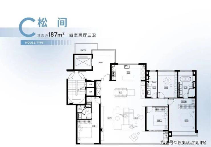 建面约187㎡四房两厅三卫,大平层户型,尺度、舒适度拉满,双套房设计,客餐厨连通,厨房带西式岛台。
