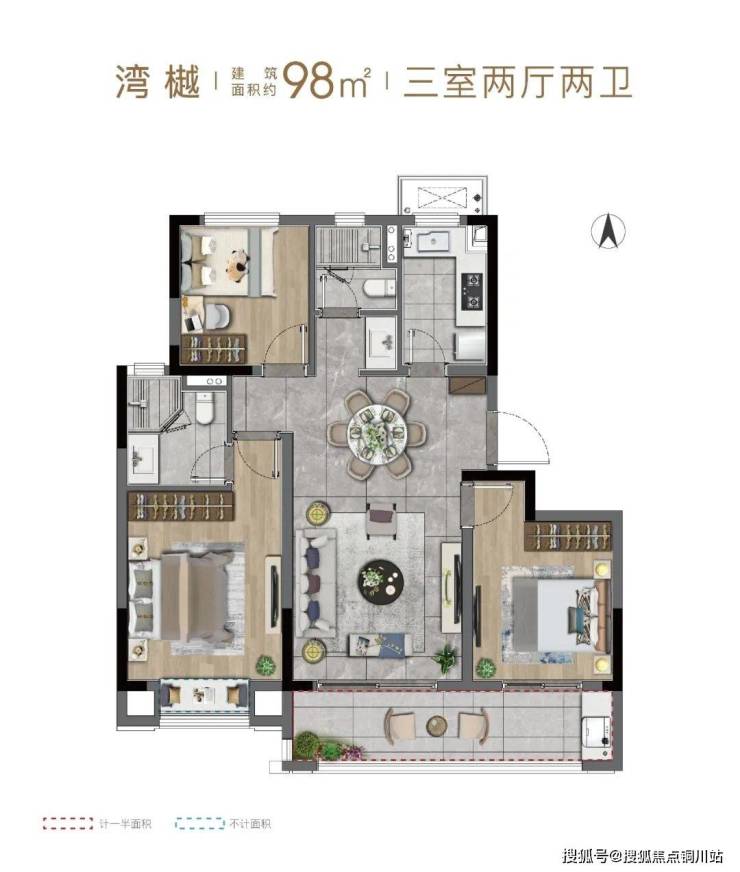 · 建面约98㎡户型更是做到了朗阔宽厅、贯穿阳台,主卧套房设计,舒适度和通透性更上一层楼。