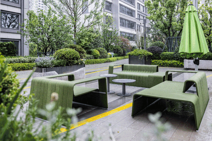 休息区的每一组形态各异的绿椅子,都藏着江心印园的浪漫与惬意。这让我联想到巴黎卢森堡公园内的绿椅子,人们在那里放松、畅谈、漫步,而绿椅子,是一切的前提。