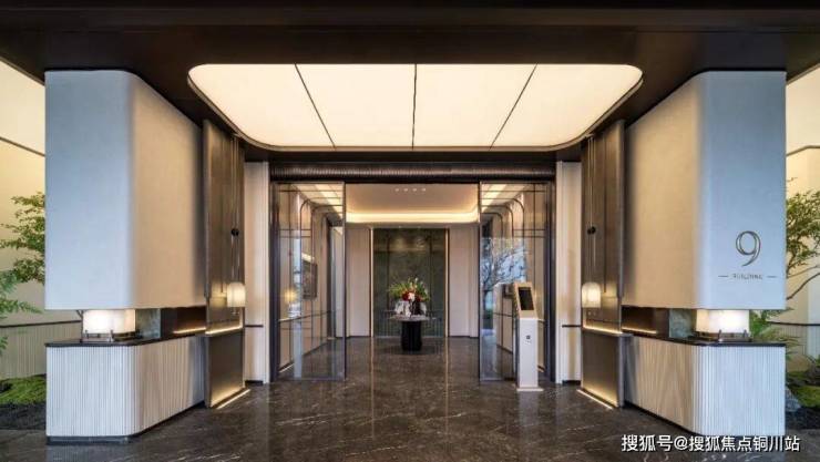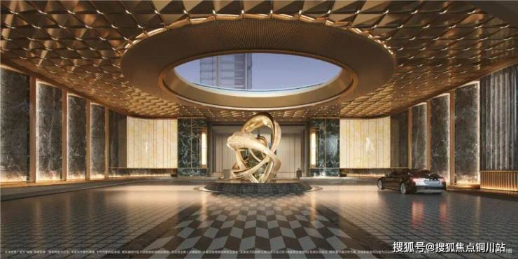 在建筑形体上,采用中心对称式构图来强调仪式感,两侧采用内凹环抱弧形墙面,酒店式环岛落客区、中央艺术水景以及顶部“万字曲水纹”图案的金属吊顶,随着灯光的虚实变化、明暗过渡将整体门厅衬托的高级又沉稳。
