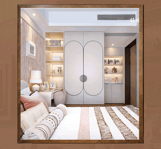 主卧套房是私密的优雅角落,拆了多余墙体更通透,L形玻璃柜体+首饰台,既是隔断又能收纳饰品化妆品,实用度拉满!弧形床背、丝光纱帘,满是温润感。