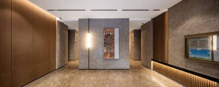 比如,社区大堂一层挑空区域增加沙发休息区,方便业主在此等候;社区大堂二层书吧区增加落地灯和艺术品,提升归家空间的艺术氛围;单元大堂搭配巨幅挂画和云石壁灯,彰显生活的雅致品味。