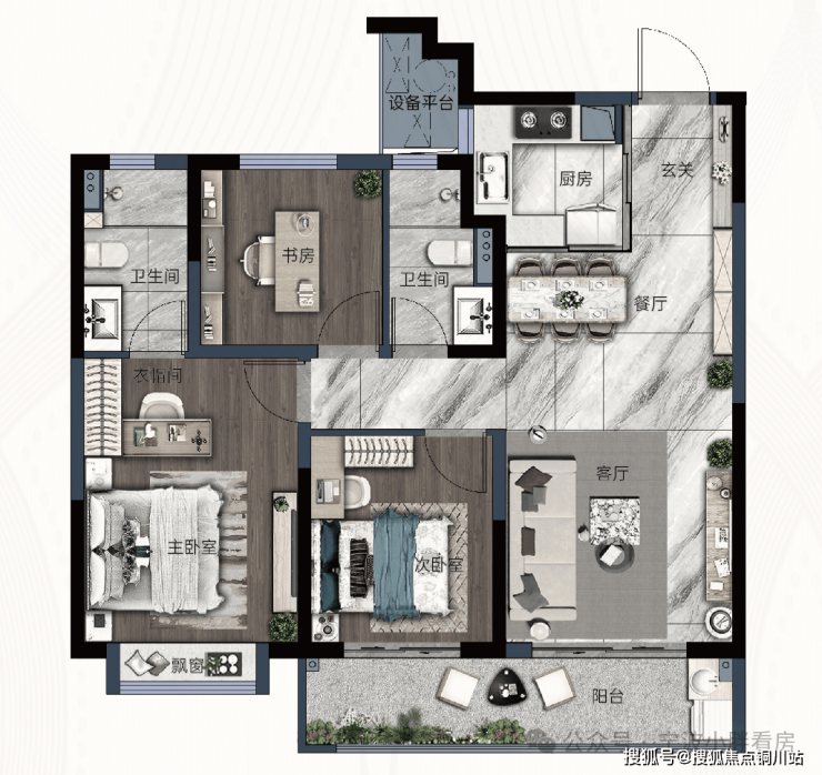 【主卧套房】设置独立卫生间、衣帽间、观景飘窗,彰显风范