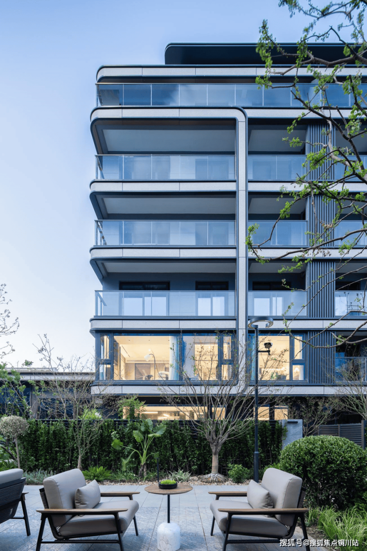 建筑顶部采用曲线造型设计,与阳台轮廓曲线相呼应,使建筑整体造型更加流畅自然,从顶部到底部的线条过渡和谐统一,提升了建筑的美观度和独特性。