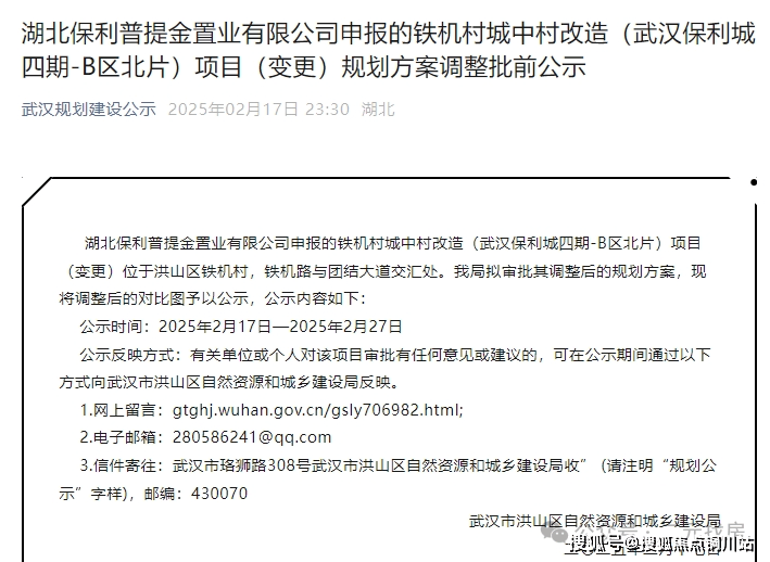 2025年2月17日,武汉保利城四期B区北片项目进行规划方案调整批前公示,这标志着保利城四期开始“商改住”。
