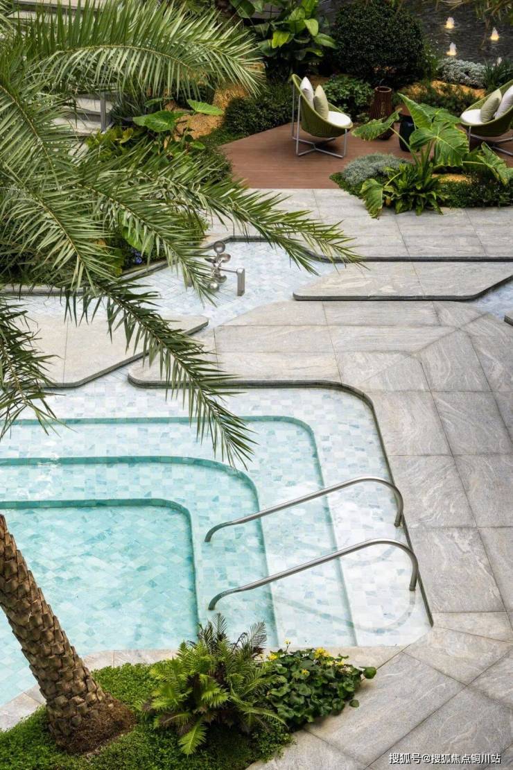 空间层次的精妙塑造,巧妙地隔绝了城市的烟火,形成了一个被绿意与水景环绕的静谧场域。 中心戏水池深度控制在约15-50cm,确保安全无忧,让成人可在此慵懒浸足,孩童能尽情嬉戏,水中漫步,如在斐济浅滩,感受清凉包裹的治愈。