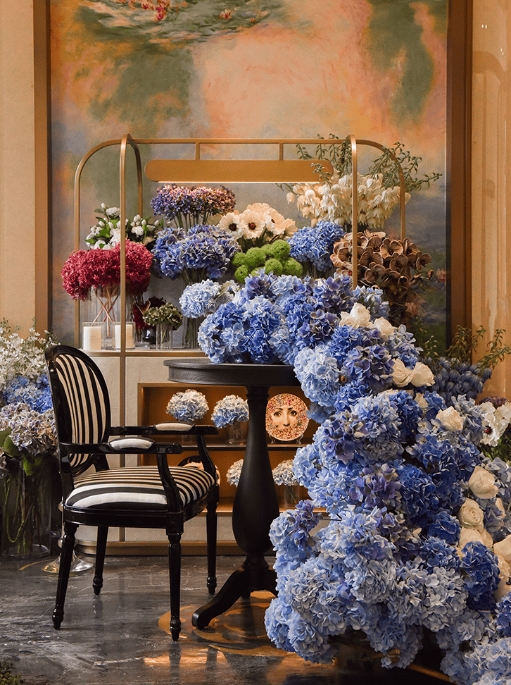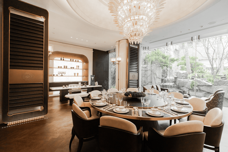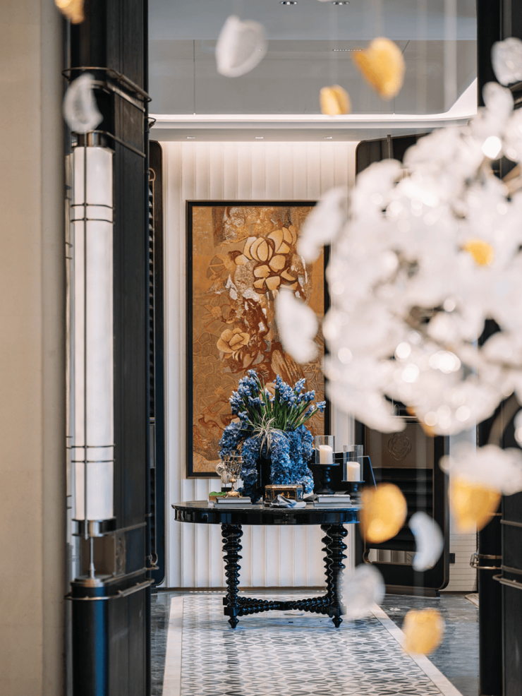 三扇山茶花瓣状的巨幅门檐,让人下意识地就端起手机拍照——莹润的汉白玉光泽下,映衬着高雅的古驰黑奢石景墙,共同组成这道约60米的奢阔门廊。