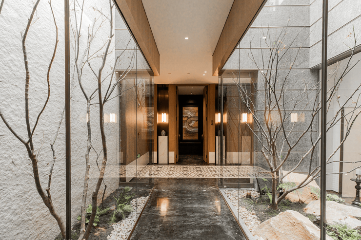 整座高定会所几乎被“镶嵌”进了山水之中,几乎每一处空间都正对着下沉式庭院,让室内与户外景观内外交融,享受天光、云影和山水雅意。