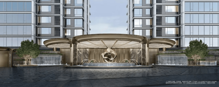在门廊之前,绿城更是不计成本地落下四组叠瀑水景,涟漪生花;中央水景以潘多拉奢石为底;落客区的地面也采用了扇形石材铺装……
