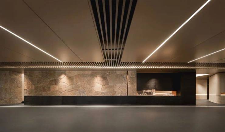 项目特别注重入口空间的体验营造。坡道入口采用铝板顶面和岩板墙面,车道两侧柱体采用同样处理,主行车道顶面布置格栅/铝板。