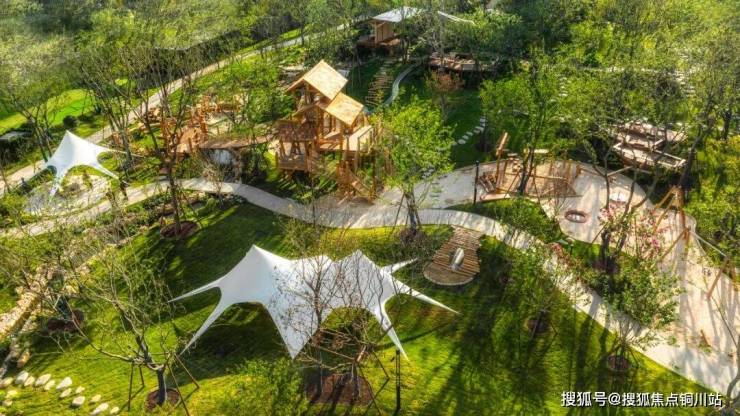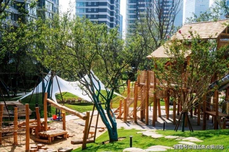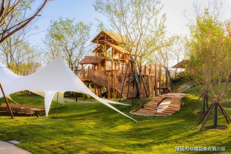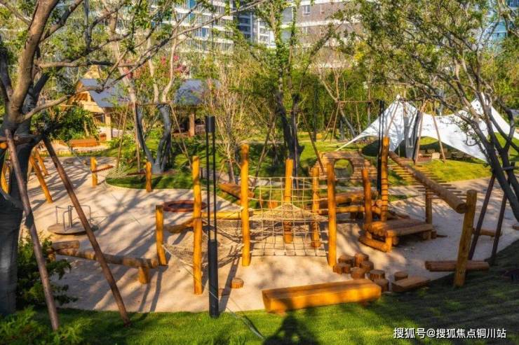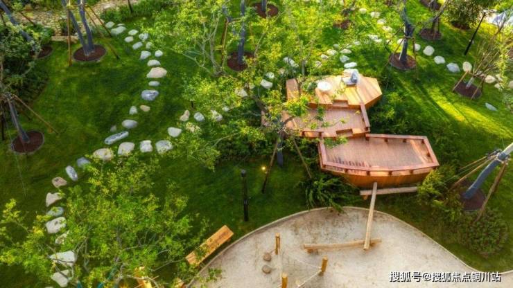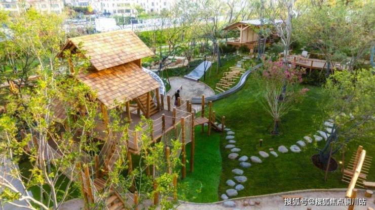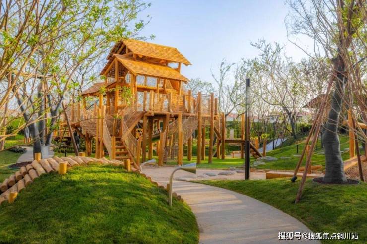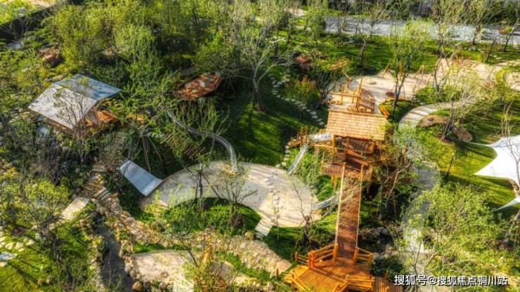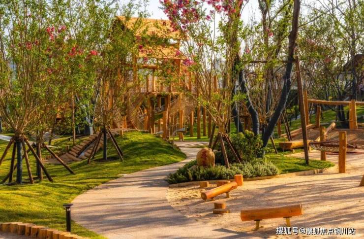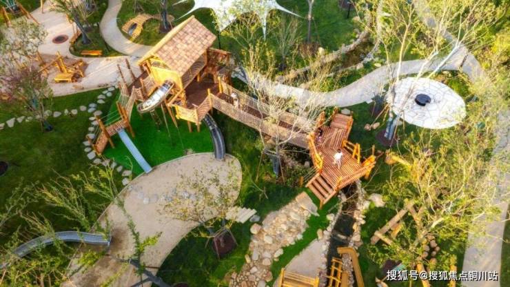 自然的熏陶与趣味的体验是孩童成长的双翼。在本次园林营造过程中,技术团队从儿童参与感和体验感出发,巧妙串联水溪、营地、草坪、沙池、山坡、树屋及地形高差,引入涵盖跑跳钻爬滑,摇转吊荡平,听看认创陪等多种兴趣热点的游乐设施,实现园林景观与游乐设施的有机融合,成功打造出充满探索与挑战的欢聚乐园。孩子们在追逐嬉戏中自然而然地结伴,在协作挑战中学会分享与沟通,逐步构建起自己的“朋友圈”。
