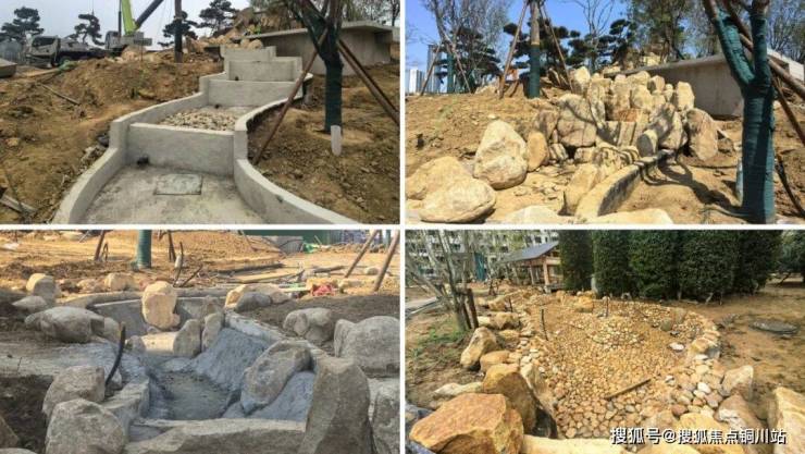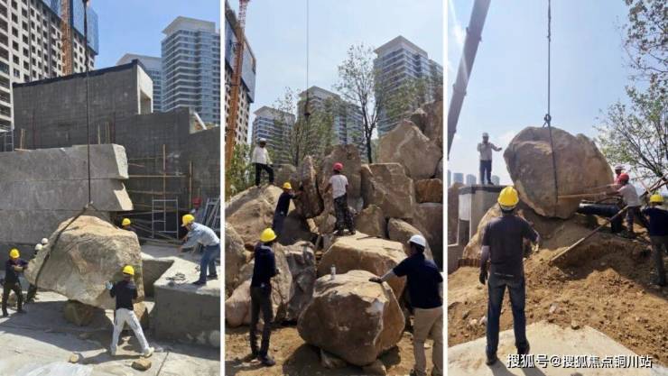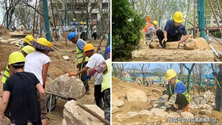 △叠山施工过程图 △特选油松 栽植 过程 图 △园区坐标打造过程图