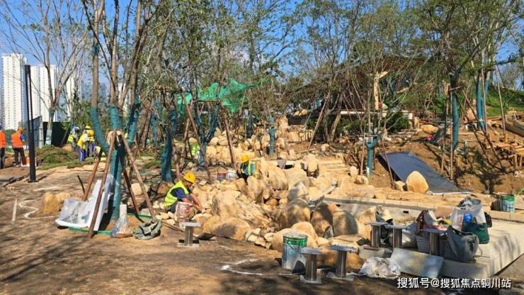 掇山又称“叠山”,贵在技艺,精在选材,妙在意境。为将昆俞山922.8米海拔高峰以100:1的比例复刻为天琴湾的园区坐标,景观团队特邀业内具有顶尖技术与精湛技艺的日本国宝级大师驻场指导;在石材臻选环节,选取与客户认知相契合、易引发情感共鸣的同色系景石,特选一座高5米重达30吨的巨石形成全区最高点泰礴顶9.228米。