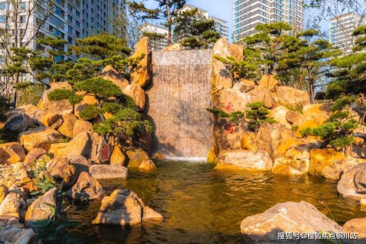 在叠山过程中 ,技术团队 从昆嵛山九龙池寻找借鉴,依据山石的颜色、形态、质地、气势和体量,灵活运用横卧、立卧、斜卧等多种摆放方式;为营造出松石交融的景观层次,技术团队匠心独运,选择在石缝间点缀栽植不同规格及造型的特选油松。同时在充分理解自然瀑布的成因与形态后,利用山体高差精心策划施工,打造出宛如天成的瀑布景观。水流自泰礴顶飞泻而下,犹如龙池飞雪般壮观震撼。
