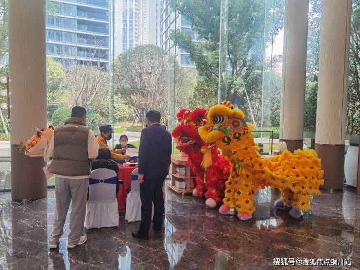 待业主步行至社区大堂门口,等待业主的是现场舞狮、登顶采青,绝对讲究。