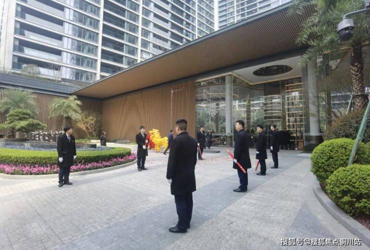 业主到达专属停车区后、2名秩序员引导停车,迎接业主下车的是6名物业人员的并排迎宾,并燃放礼花。