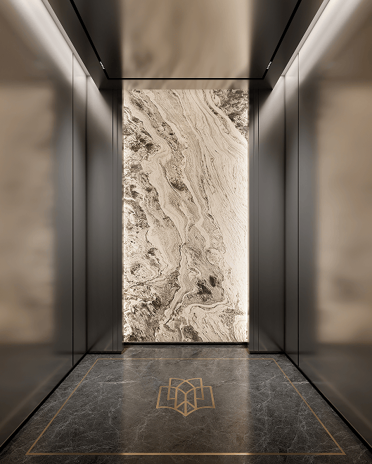 从底部延伸至顶部的铝板电梯厅,以及大面积大理石和大面积金属包装的电梯轿厢,不放过任何一个归家动线上的奢华体验。