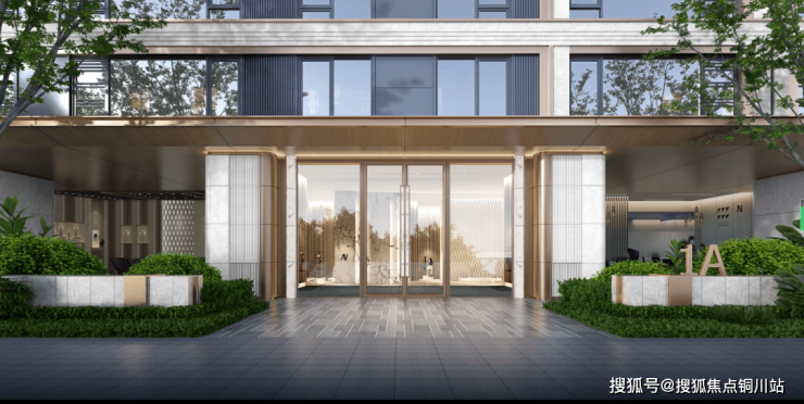 单元大堂立面延续主体现代雅奢风格,立面简约利落,以米白色月光米黄石材、香槟金铝板及潘多拉彩虹印象奢石呼应主体白金色调,以精工细节强化立面品质,石材采用波浪纹、圆弧倒角、拉槽、抛光等细节工艺,铝板采用倒角、凹槽结合密拼工艺,提升归家尊贵感。