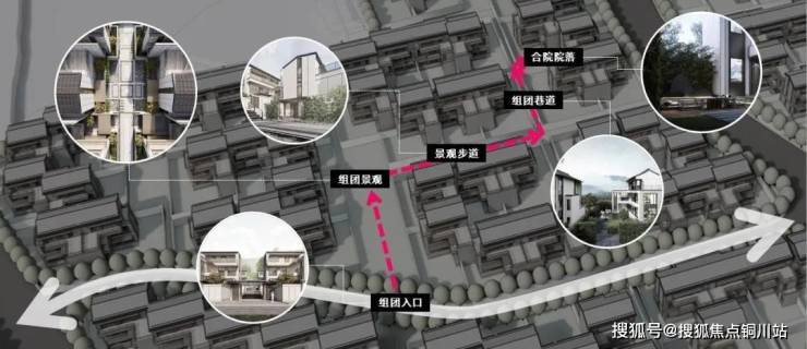 “横街纵巷”的外部空间串联起不同组团,形成连续、流动、贯通的社区内部交通联系与公共空间。进入组团都要经过组团入口,到组团景观,再经过组团步道和景观巷道,最终来到合院院落。五重空间的转换,在自然形态中融入归家礼序。