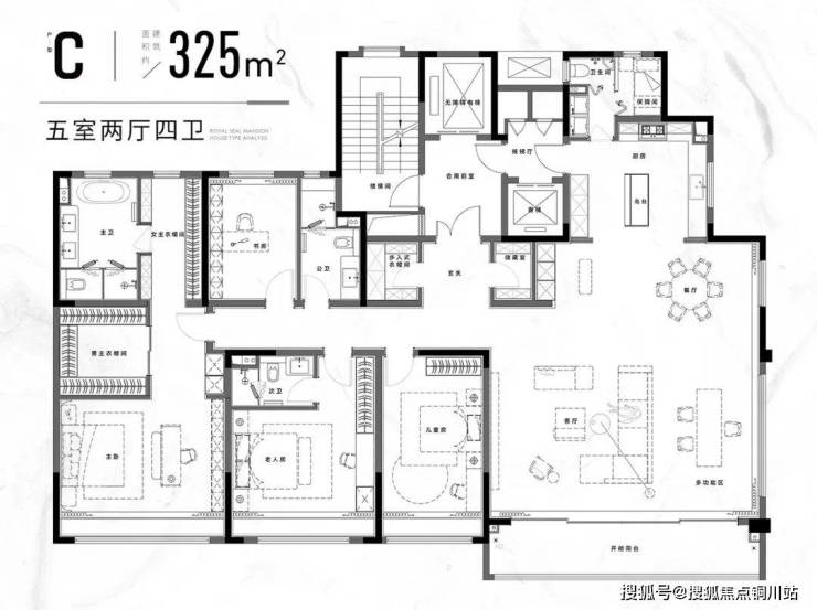 这个325㎡五室两厅四卫的户型亮点非常突出——