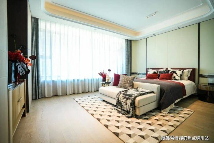 5.6米双衣帽间主卧套房 5.6米宽境主卧,尺寸比一般的客厅还要宽敞,它打破了传统卧室空间的局限,以超乎想象的尺度感,营造出一片专属主人的私密天地。不仅能轻松放置超大尺寸的豪华床铺,还能划分出独立的休闲区域,再加上 男/女主人双衣帽间设计,诠释了何为豪宅主卧的奢阔尺度与非凡品质。