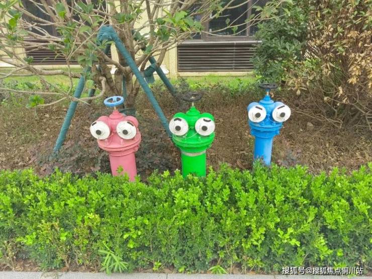 消防栓被涂鸦成可爱的图案,在草丛中多了些许儿童色彩↓