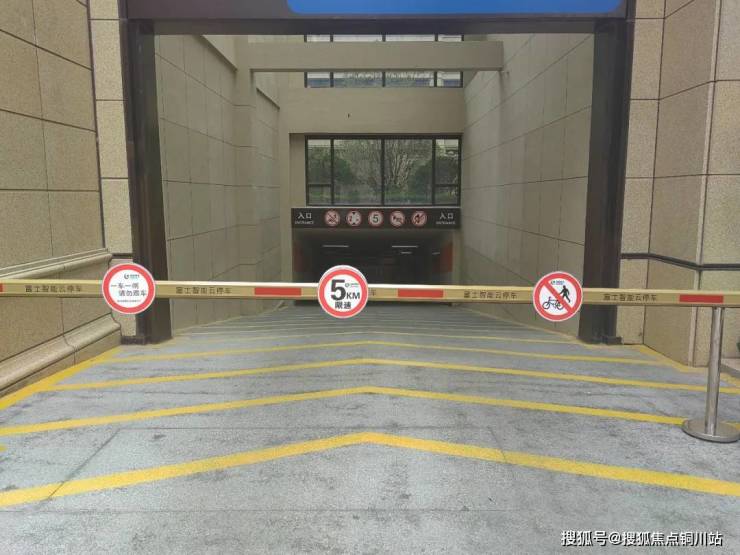 小区实行全人车分流设计,在大门一侧即为小区地下车库出入口,抬杆上挂有限速5KM、禁止行人及非机动车、温馨提示等标语↓