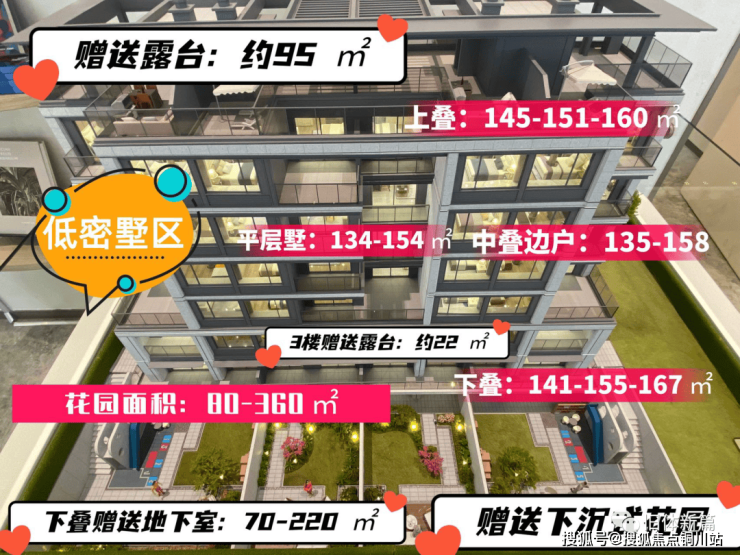 上叠:约144-152平米,独立电梯入户,三层复式结构。上叠中间套,部分户型有六层退露台,约16平米的超大花园露台。屋顶露台超大扩展面积,且飘板设计较大,后期可自行改造利用