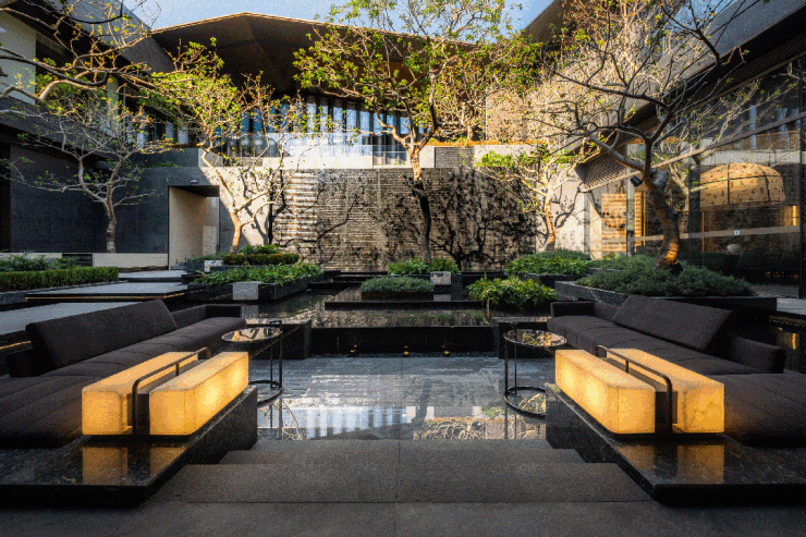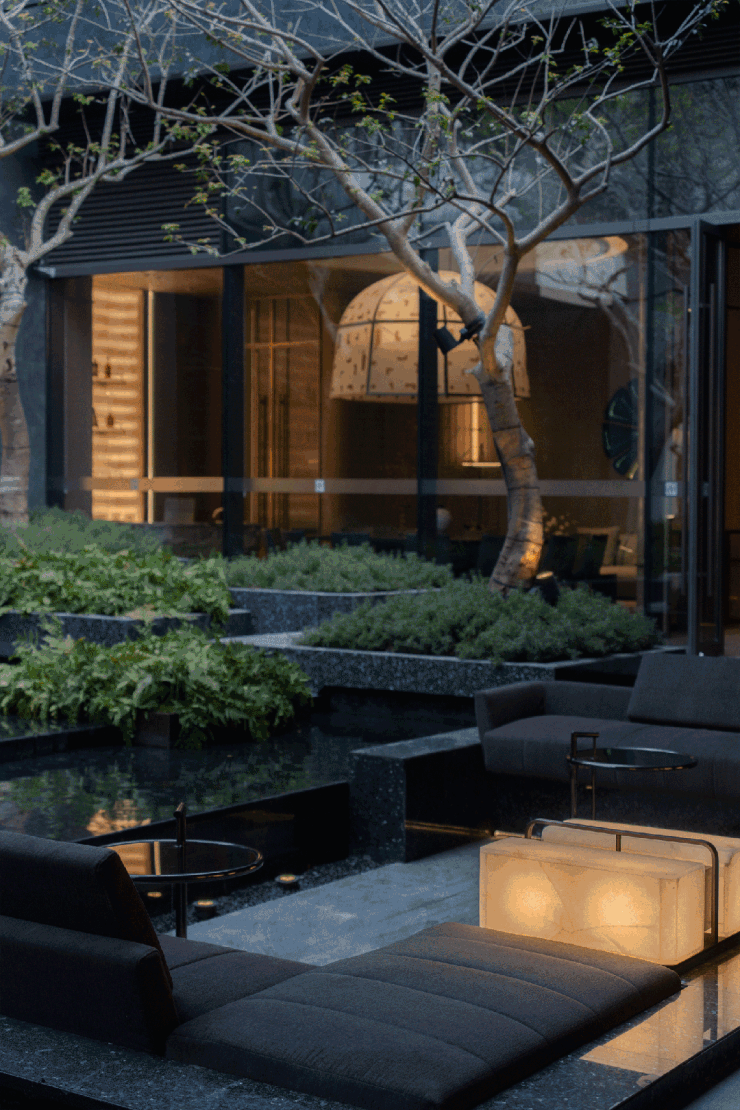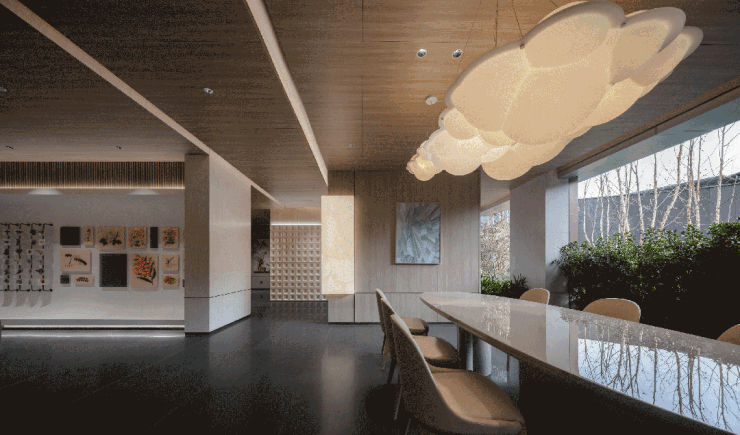 约340㎡的下沉式庭院,与约4米高、10米宽的水瀑形成立体空间。身处会所之内,透过落地玻璃,庭院内的叠瀑、乌桕尽收眼底,室内外景致浑然一体。
