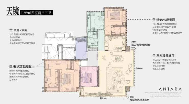 户型规划亦顺应江景及规划肌理,打造全景超广角观江的L型角厅户型——通过东向、南向双阳台设计,使整个产品拥有约60㎡的可观江景公区面积。形成270°视野,打造约6.6m的“观景角厅+环幕双阳台”的双向落地窗格局。把“东+南+北”所有能观景的面都打开,构成一个约35m宽观江面、近60%的观景视界(河西对岸只可西侧或北侧局部观江)。