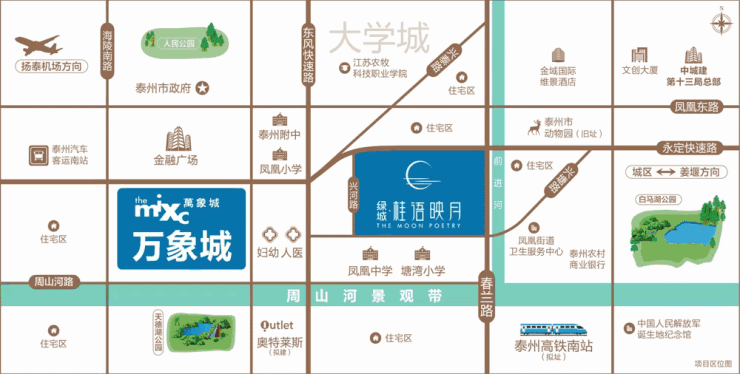 医疗配套:直线距离 1 公里范围便是泰州新区人民医院,以及规划中的泰州主城区唯一的妇幼保健所。楼盘 5 公里范围内有 2 个三甲医院,最近的是泰州市人民医院,距离楼盘 1407 米。