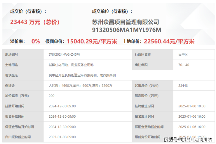 东吴序,即,苏地2024-WG-Z45号地块,位于吴中经开区长桥街道宝带西路南侧、龙西路西侧,1月8日,吴中建设以底价23443万元竞得,成交楼面价15040元/平。