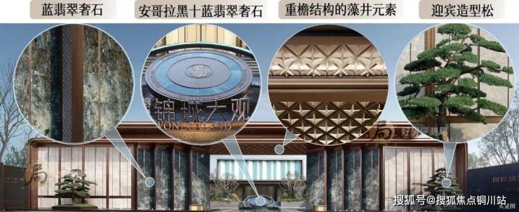 入口大门甄选昂贵的马达加斯加蓝翡翠奢石,镶嵌宫廷御用藻井片,尽显尊崇礼序;中央水景则匠心独运,以整块奢石精琢成巨大玉璧,其形意深蕴“四方来财,海纳百川”之祥瑞愿景。