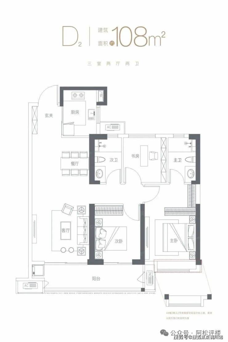 建面约108平,三房两厅两卫: