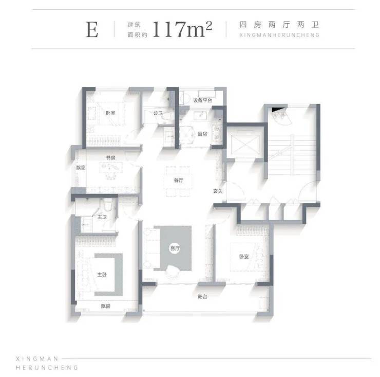约117㎡户型点评:全明方正通透, 提升空间利用率,LDKB一体,营造大尺度餐客双厅, 亲朋从容相聚,双开间观景阳台, 晾晒之余, 亦可成为兴趣天地,四房功能, 让家庭成长的理想一步到位