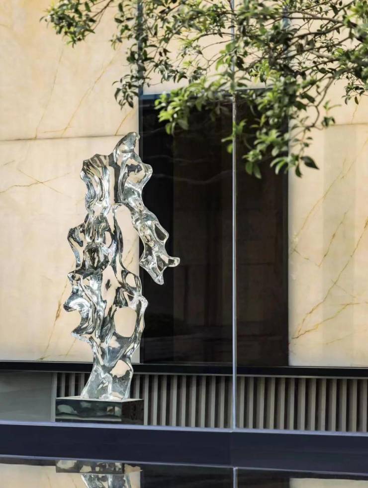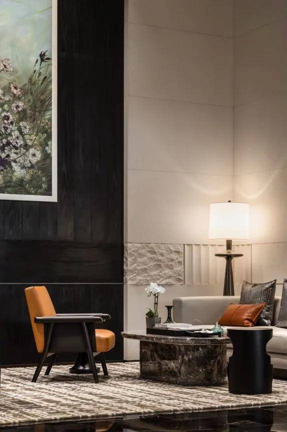 再比如,室内大面积使用了土耳其进口的卡特米勒石材,经过精心切割打磨成三种形制;地板使用了来自意大利的瑞吉灰石材等带来高奢酒店的艺术感与质感。