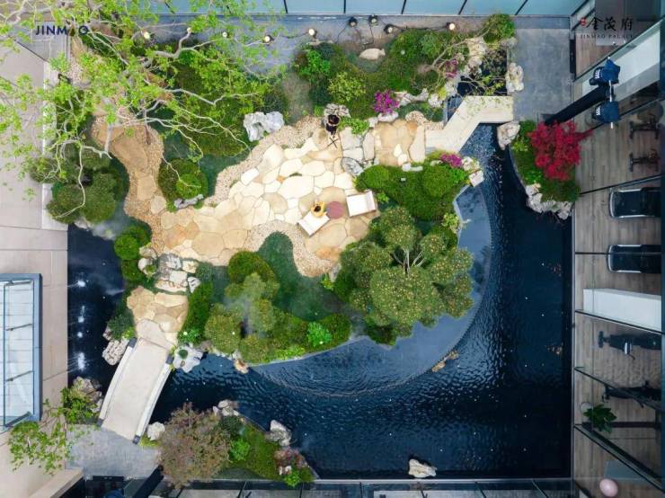 果不其然,金茂在示范区还真就打造了一座以孔明灯造型为灵感的茶室,搭配自然石滩和碎石汀步,古画中才有的隐士生活这不就跃然眼前了!