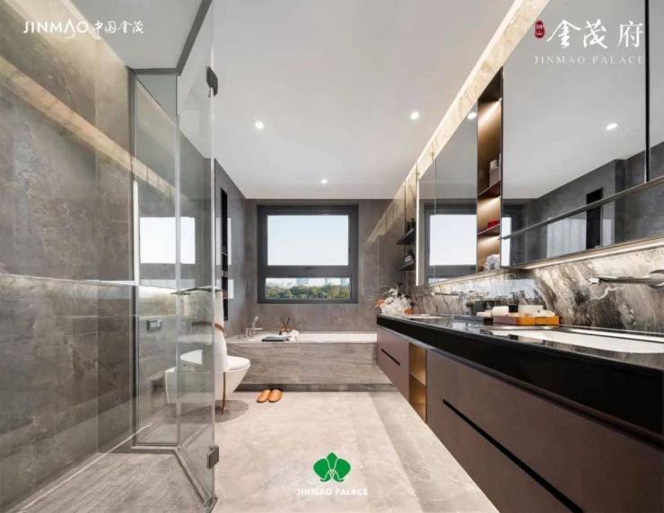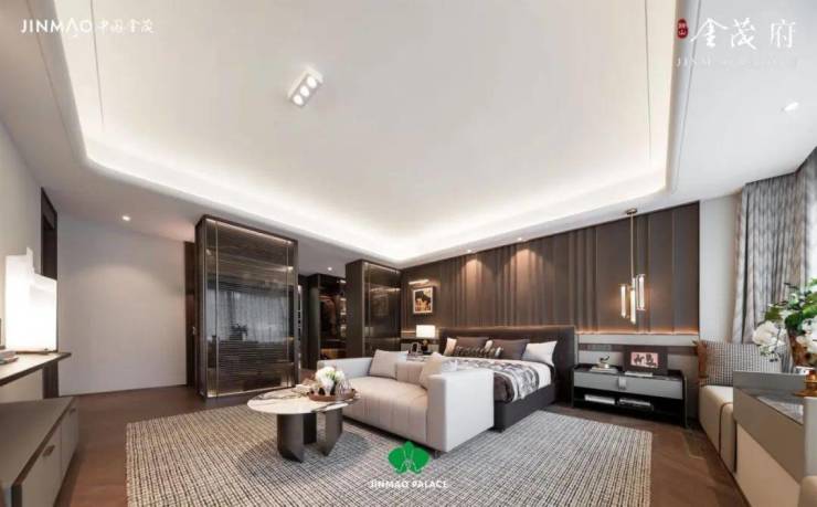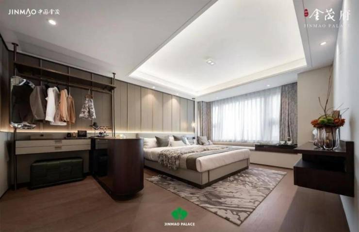 3、主卧客卧双套房设计,私密又便捷;主卧配备步入式衣帽间+豪华卫浴+270°转角阳台,金茂把居住舒适度照顾到了方方面面。