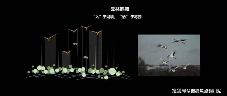 立意取自梦泽湖生态美景,从展翅飞翔的水鸟提取建筑塔冠意向,建筑以水鸟鹤舞飞翔的姿态形成群组特性,顺应自然生态界面,也呼应着城市大生态格局。