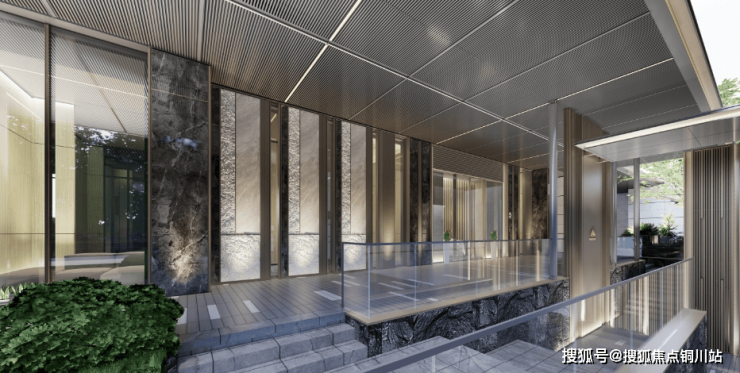 中轴对称的入口空间,大雨棚营造亲和舒适的归家感受,亮金色的金属与石材的搭配烘托高端的社区品质。