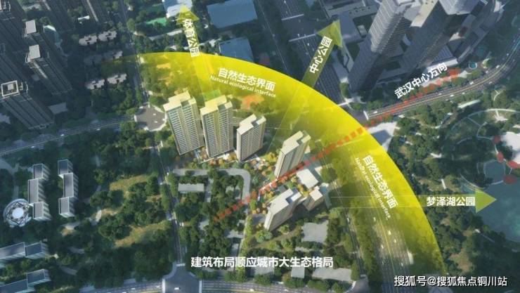 基地有着卓越的地理位置与景观资源,北侧高层可一览体育公园自然人文景观。住宅南北向布局,建筑向景观方向偏转,具有内观花园远眺梦泽湖的无敌景观体验。