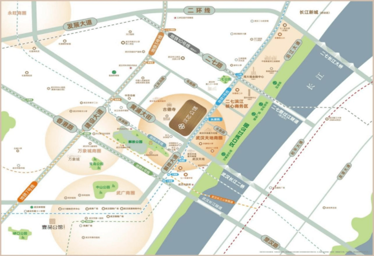 地处城市主轴之上,四通八达九省通衢。汇萃双环两桥三轴两纵的枢纽交通,畅达武汉三镇核心区,轻轨1号线头道街站、城市公交站就在家门口,地处武汉大道与解放大道的交汇处,眼前的沿江码头别有风情、让出行更显风雅,形成“水陆空”多功能、快速通畅的立体交通体系,让两江四岸、五湖四海的璀璨触手可得。