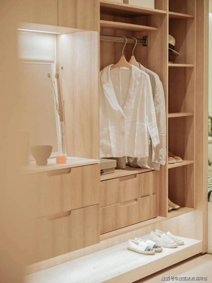 整面定制柜是生活的 “秩序感起点”,鞋柜分层露出常穿的舒适鞋履,顶层摆上常带的帆布包和雨伞,乱中有序的烟火气,让归家第一步就卸下紧绷;