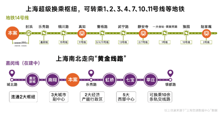 交通能级不断跃升:14号线和嘉闵线(在建中)双轨交汇,步行约200米14号线地铁口,14号线为高能级地铁线,5站普陀,30分钟直达静安,且始发有座,出行舒适;黄金走廊嘉闵线加速建设,约3站虹桥枢纽,未来可速达七宝、徐家汇、莘庄等核心区域。项目周边开泰路即将建成,绿野谷二期路段、骏达路、童家桥路、昌瑞路、涟澜路已启动建设,预计2026年建成。
