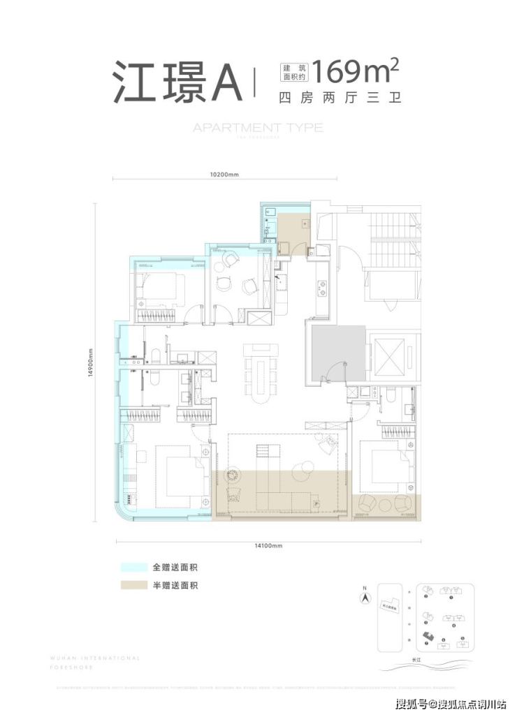 这是7号楼建面约169㎡的江璟A户型,四房两厅三卫