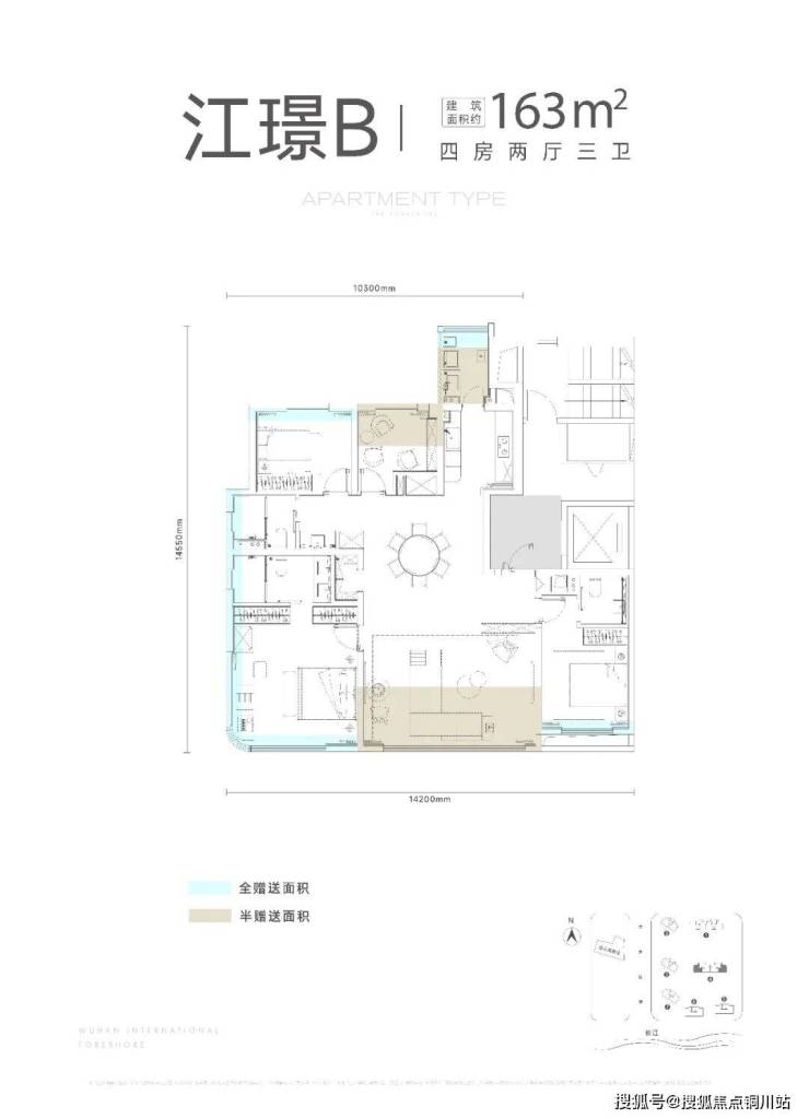 其次,约169㎡户型的南向开间约14.1m,三面采光面逼近约40m,这同样是目前武汉同级别产品设计最优越的